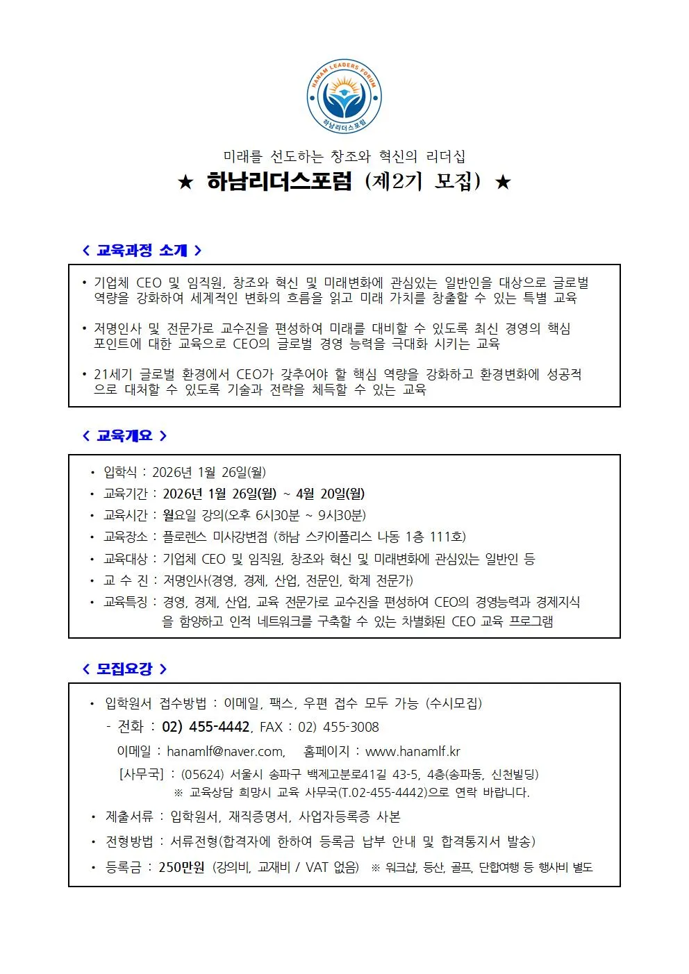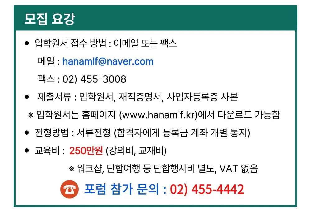 하남리더스포럼 입학원서 양식을 다운 받아 작성하신 후 메일